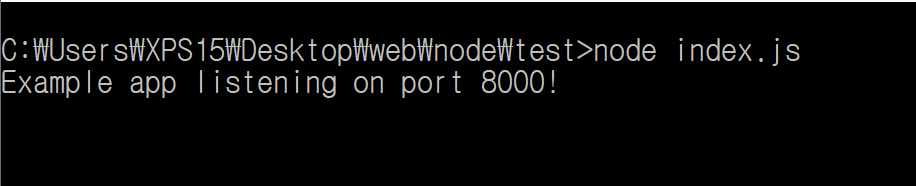 var express = require('express'); var app = express(); app.get('/', function (req, res) { res.send('Hello World!'); }); app.listen(8000, function () { console.log('Example app listening on port 8000!'); });에디터에 다음과 같이 입력한 뒤 다시 cmd로 돌아와서 node.js 를 실행합니다.