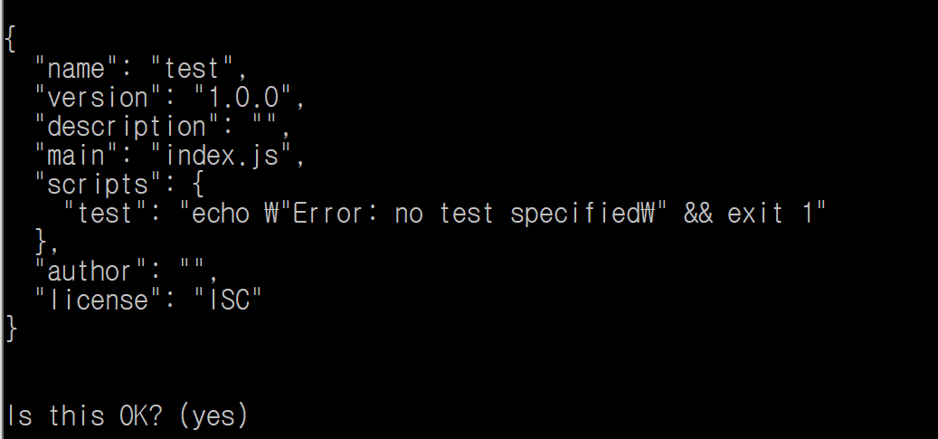 계속 엔터를 누르면 마지막으로 맞는지 확인하는 게 나오고 여기서 엔터를 누르면 package를 초기화 해주게 됩니다.