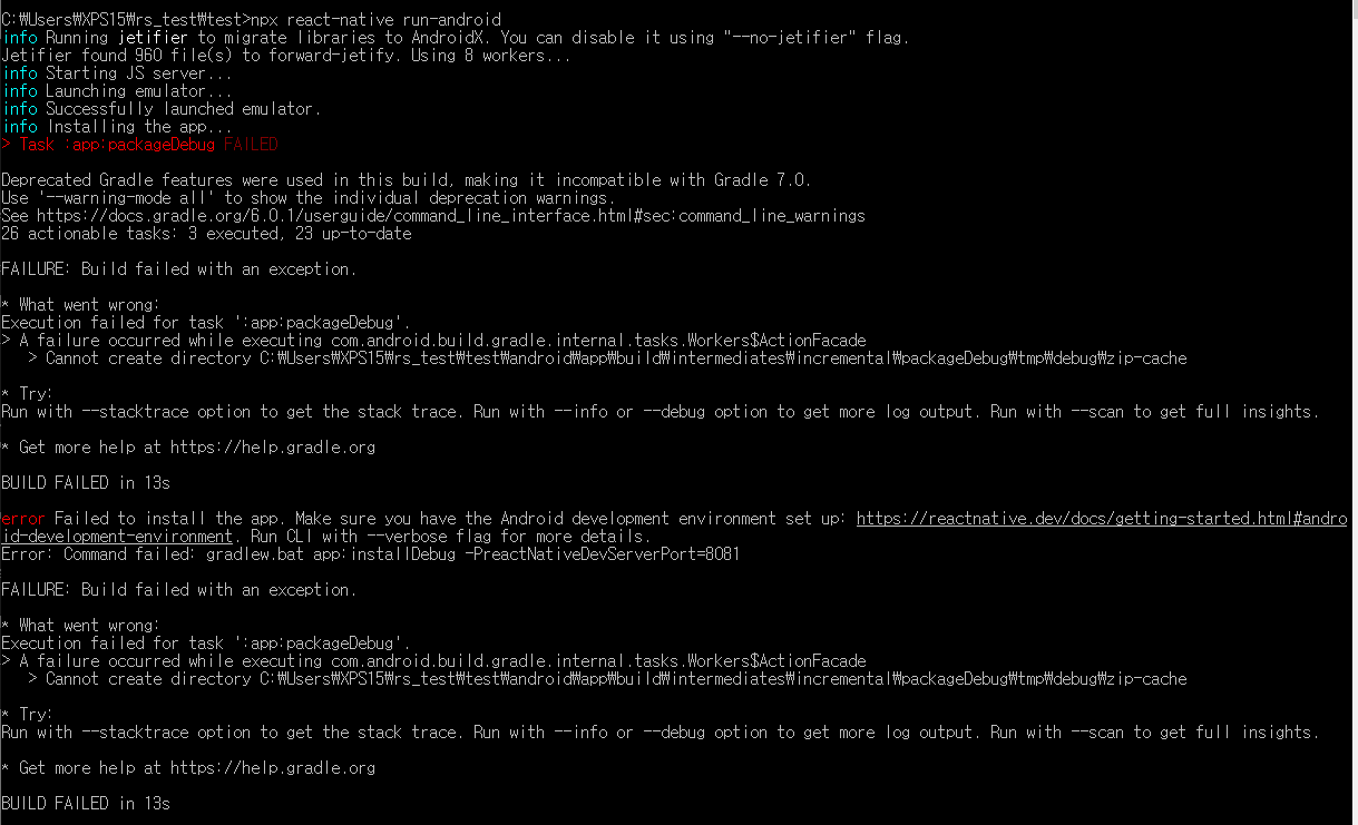 Error: Command failed: gradlew.bat app:installDebug -PreactNativeDevServerPort=8081에러가 발생하였다.