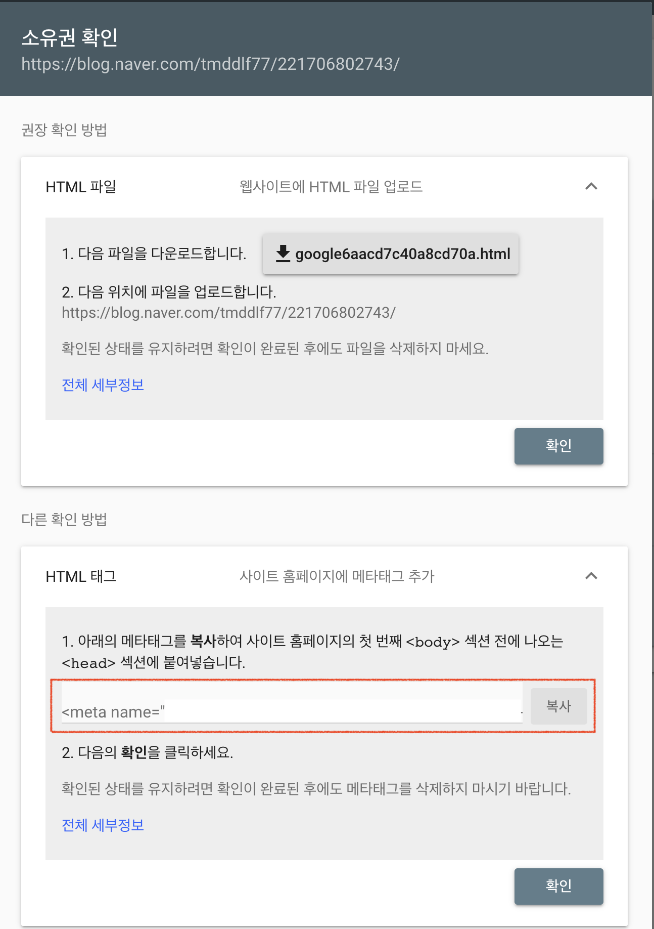 3. 소유권 확인 창이 나오면 HTML태그창을 누른뒤 HTML태그를 복사해 준 뒤에 확인 버튼을 눌러줍니다.